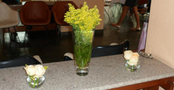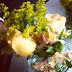 Para os arranjos, fui na Cadeg no sábado e comprei muitas flores. Rosas chá e amarelas, astromélias em vários tons de amarelo e uma florzinha miudinha que eu não sei o nome mas diria que tem o efeito de chuva de prata, só que em amarelo. Usei vidrinhos que comprei lá na Cadeg mesmo (R$ 2,50 cada um, que lindeza) e outros menores que tinha comprado pro meu casamento.